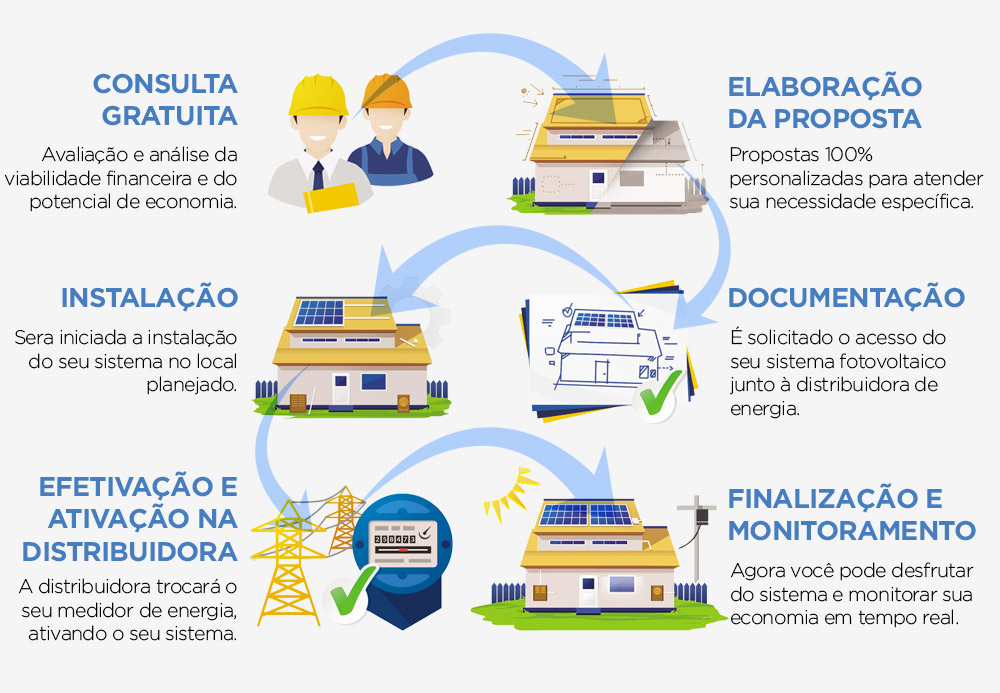 Acompanhe as etapas ao lado e veja como é simples solicitar a instalação do seu sistema fotovoltaico e começar a economizar na sua conta de luz!